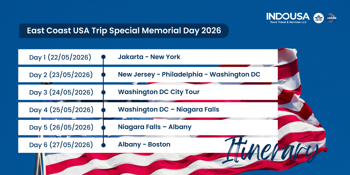 Join INDOUSA Travel on our East Coast USA Special Memorial Day Trip 2026, a special 11 days and 10 nights adventure from 22 May to 1 June 2026. This thoughtfully designed journey takes you through some of America’s most iconic cities, including New York City, Boston, and Washington, D.C., where history, culture, and vibrant city life come together.