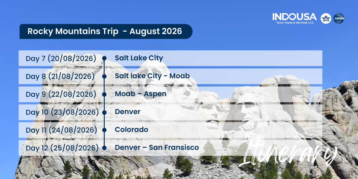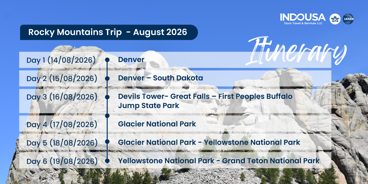 Join our Rocky Mountains Trip, a memorable 12 days and 11 nights journey taking place from 14–25 August 2026. Travel together through some of America’s most breathtaking natural wonders, including Yellowstone National Park, Grand Teton National Park, Mount Rushmore, Devils Tower, and other unique destinations you won’t find on typical U.S. itineraries.