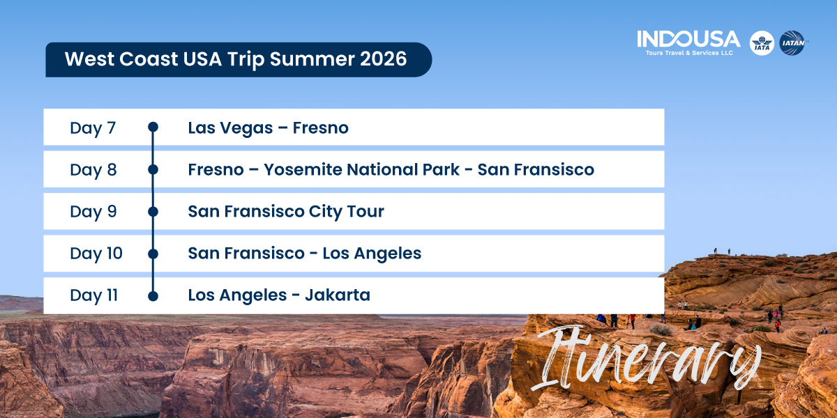 Join our West Coast USA Special Summer 2026 trip! An unforgettable 11 days and 10 nights journey through some of America’s most iconic destinations. From the vibrant energy of Los Angeles, the timeless charm of San Francisco, to the dazzling lights of Las Vegas, each city offers its own unique highlights and unforgettable experiences.